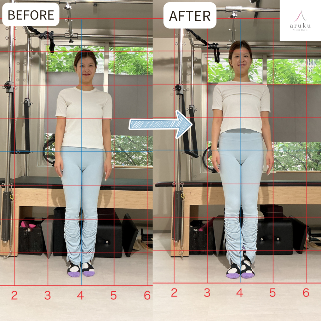 After写真では、骨盤が正しい位置に戻り、腰の過度な反りが改善されています。お腹のラインがすっきりし、横から見たシルエット全体が整っているのがわかります。「腰の重だるさが楽になった」「スタイルが変わったと言われた」というご感想をいただくことも多いです。