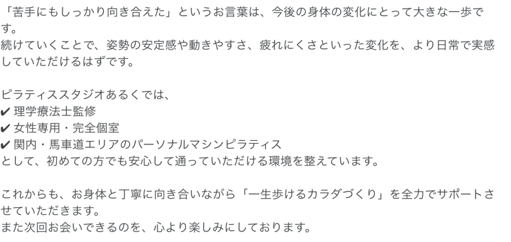 姿勢や動きのクセを的確に捉える 2025 12/27 お客様の声 2025年12月27日 お客様の声 よかったらシェアしてね! URLをコピーする URLをコピーしました! URLをコピーしました! オンラインピラティス 1月開催スケジュール 関連記事 継続的に通いたいと思います 2025年11月3日 適切に姿勢を評価 2025年11月1日 before⇔afterでカラダの変化がわかる 2025年10月29日 歪みが整えられた 2025年10月29日 これからのゴルフシーズンでいい影響がでること・・・ 2025年10月3日 猫背治ってました 2025年10月3日 灯りが見えた。安心して通えそう 2025年9月6日 楽しくピラティスができた 2025年9月6日