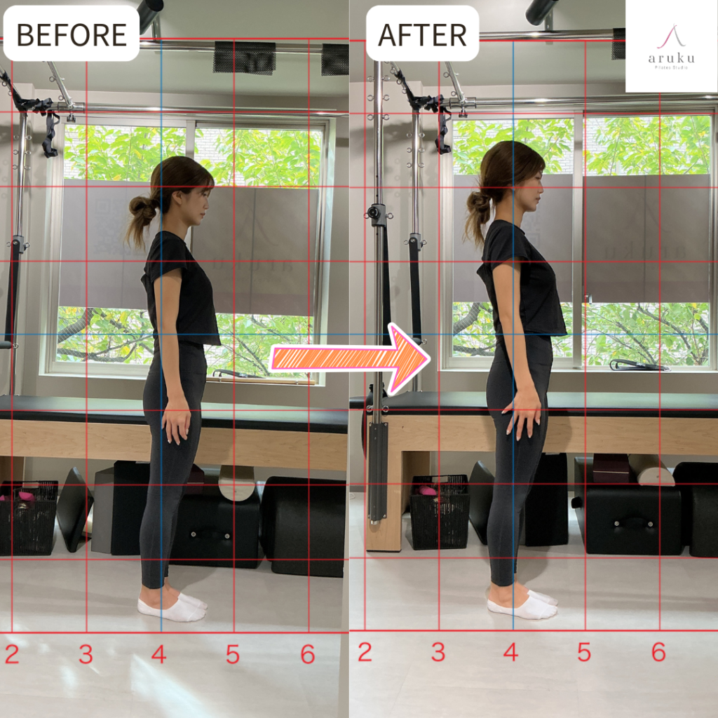 arukuのマシンピラティスでは、理学療法士の資格を持つインストラクターが姿勢分析を行い、頭部前方突出・猫背の原因となっている頸部・胸椎・肩甲骨まわりのインナーマッスルの弱さと胸まわりの硬さに対して同時にアプローチします。体の深部から姿勢を整えることで、意識しなくても自然と背筋の伸びた美しい立ち姿が保てる体をつくっていきます。