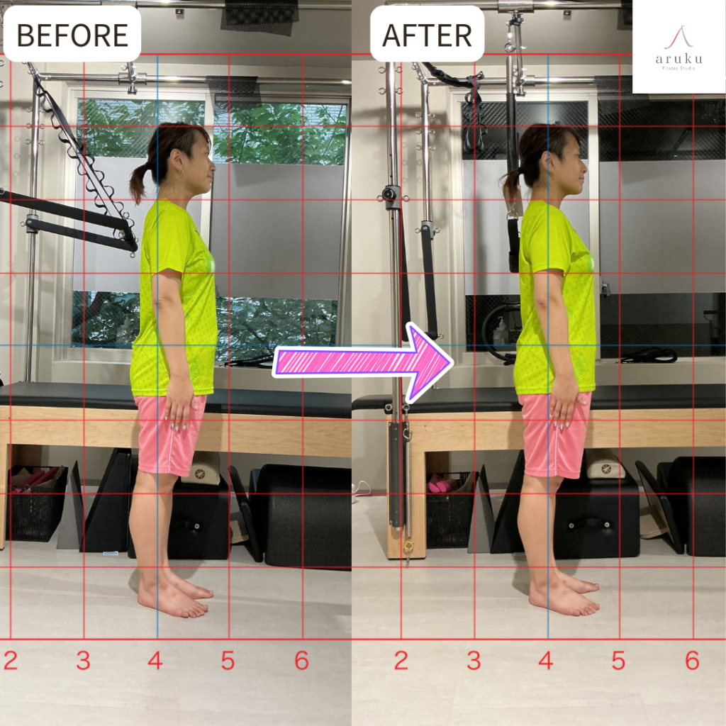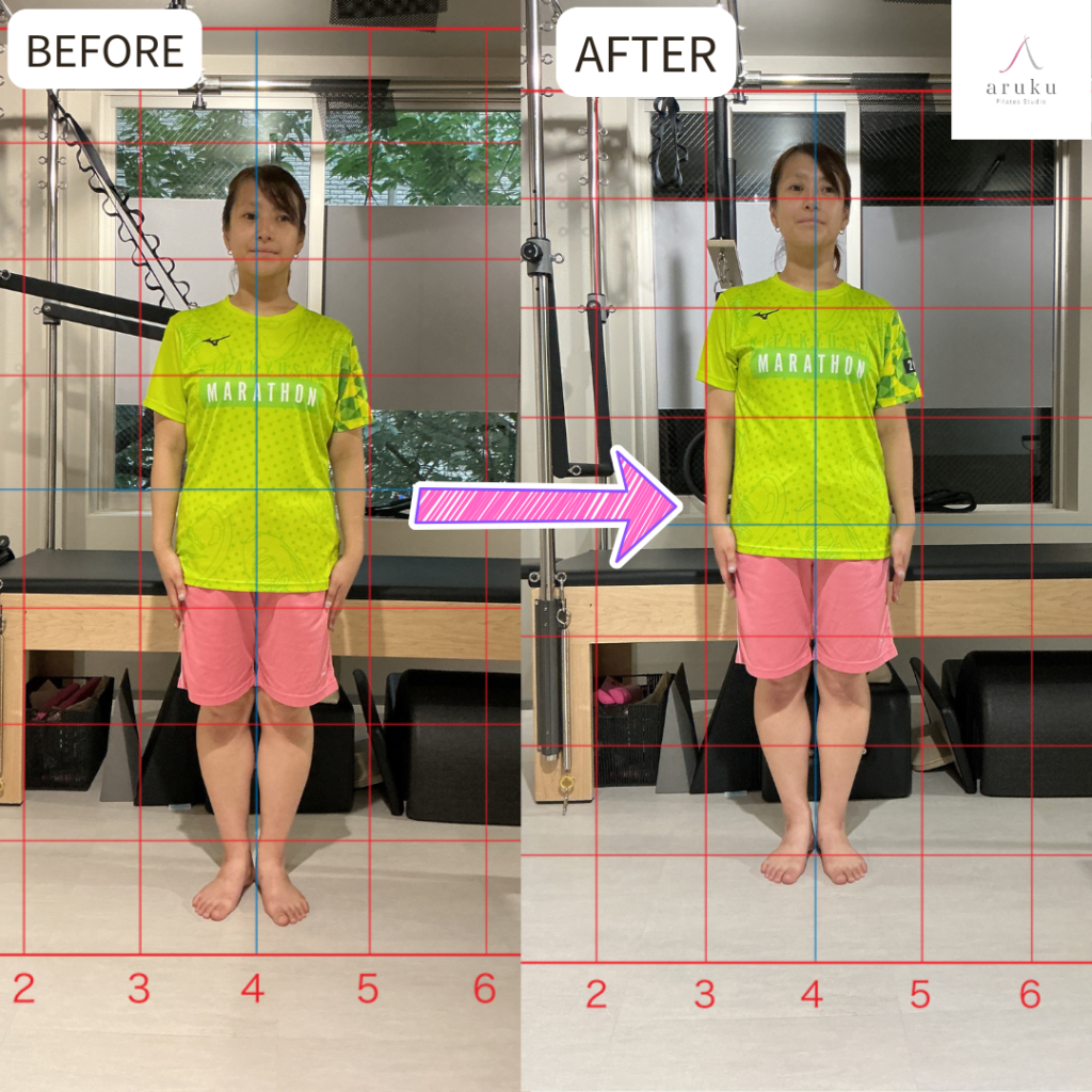 After写真では、頭・肩・骨盤・くるぶしのラインが縦にきれいに揃い、体幹が安定したすっきりとした立ち姿になっているのがわかります。左右差も改善され、より効率的に体を動かせる土台が整っています。